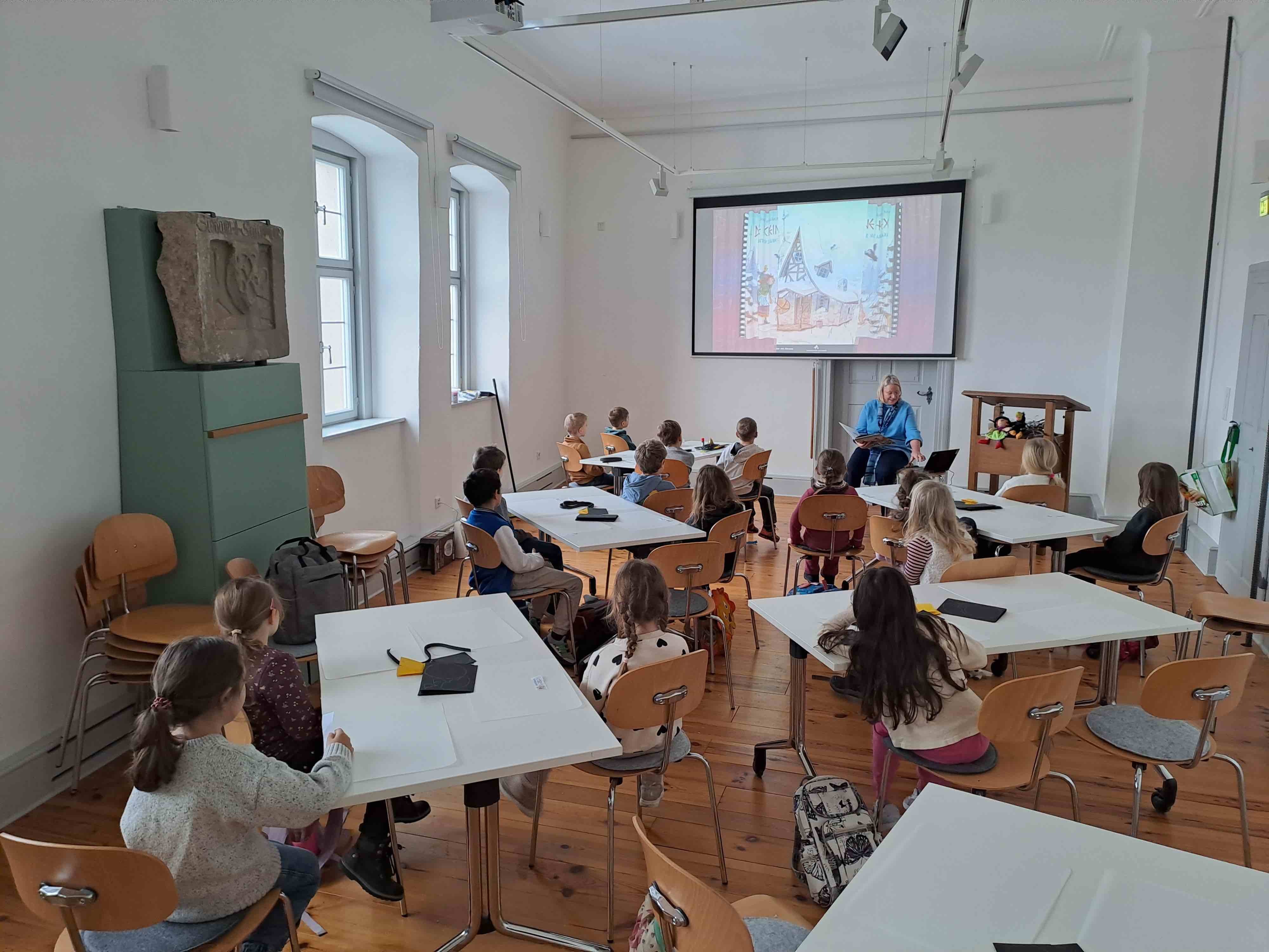 Museumspädagogin Eva Hahn las die Geschichte „Die kleine Hexe – Winterzauber mit Abraxas“ und illustrierte das Vorlesen mit vielen Bildern. Die Kinder der ersten Klassen lauschten gespannt. Danach durften sie sich zum Lied „ Ich bin die kleine Hexe und trage rote Strümpf´“ ausgiebig bewegen. Im Anschluss stärkten sich die Kinder mit mitgebrachtem Essen und Trinken.